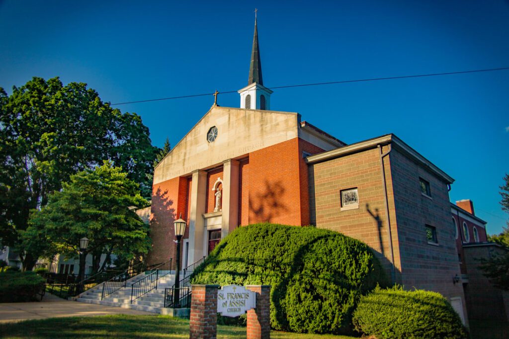 As the ninth offspring of St. Mary’s Church in New Britain, St. Francis of Assisi Parish was formed in 1942, with the Reverend James K. Brophy designated as Pastor. Soon after, the site for the new church and rectory was selected. The Stanley School Auditorium was used for Mass until the basement chapel of the church could be completed. Over the next six years, the membership of the parish grew to 1,400. During these years, “Father Brophy’s Minstrels” were well known and raised thousands of dollars to help build the parish church.